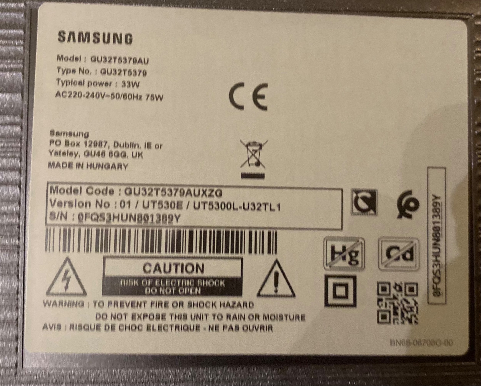 Ich verschenke einen fast neuen Fernseher SAMSUNG GU32T5379AU. Der Samsung GU32T5379AU ist ein Fernseher mit einer Bildschirmdiagonale von 32 Zoll (80 cm). Er verbraucht durchschnittlich 33 Watt Strom und hat eine Energieeffizienzklassifikation von A bis G. Im Standby-Modus beträgt der Stromverbrauch 0,5 Watt. Der Fernseher verfügt über eine Display-Auflösung von 1920 x 1080 Pixel und nutzt die LED-Technologie für eine qualitativ hochwertige Bildwiedergabe. https://www.bedienungsanleitu.ng/samsung/gu32t5379au/anleitung Breite (ohne Standfuß) 737.4 mm Tiefe (ohne Standfuß) 74.1 mm Höhe (ohne Standfuß) 438 mm Gerätebreite (inkl. Fuß) 737.4 mm Gerätetiefe (inkl. Fuß) 150.5 mm Gerätehöhe (inkl. Fuß) 465.4 mm Gewicht (ohne Ständer) 4000 g Gewicht (mit Ständer) 4100 g