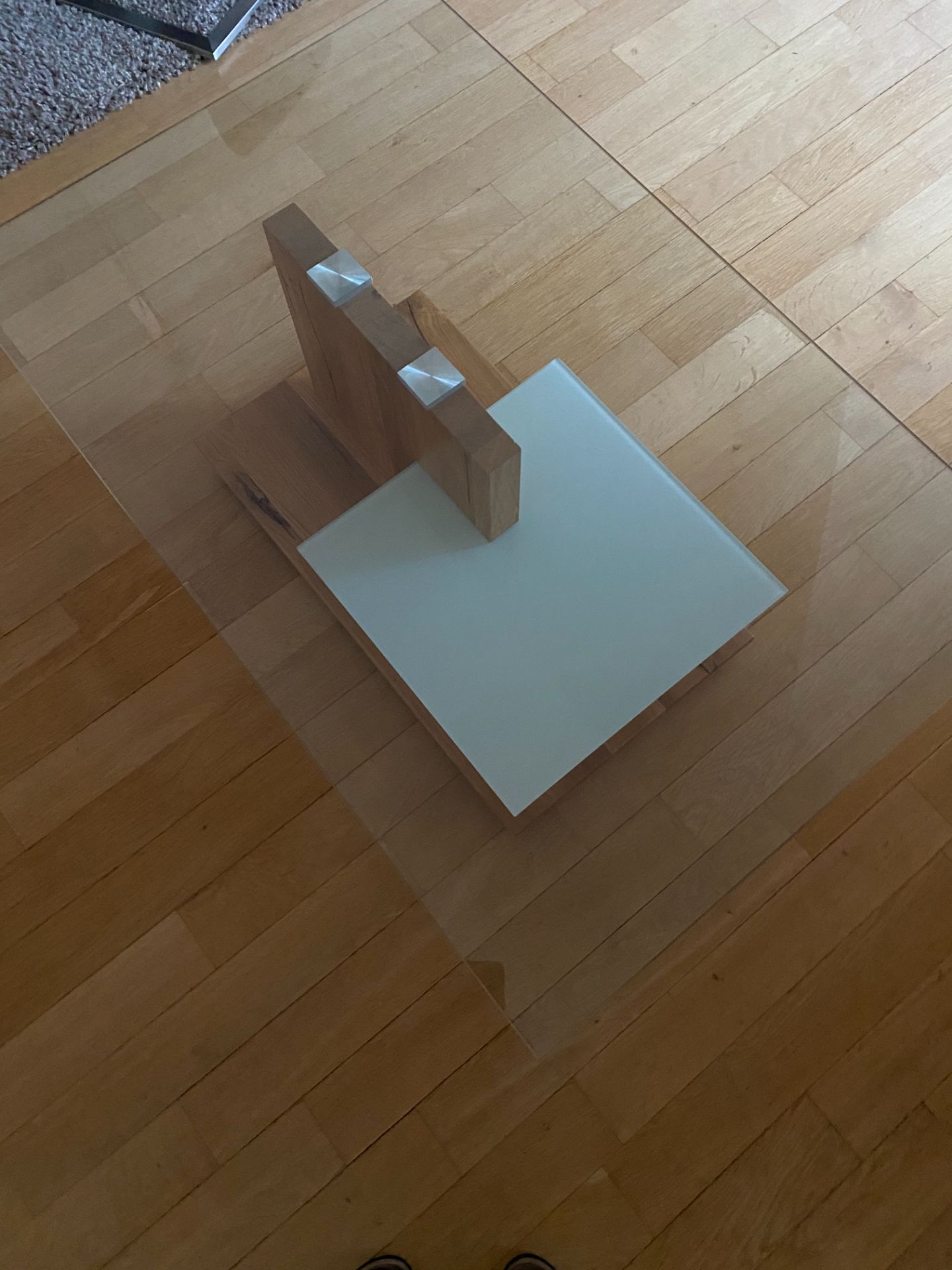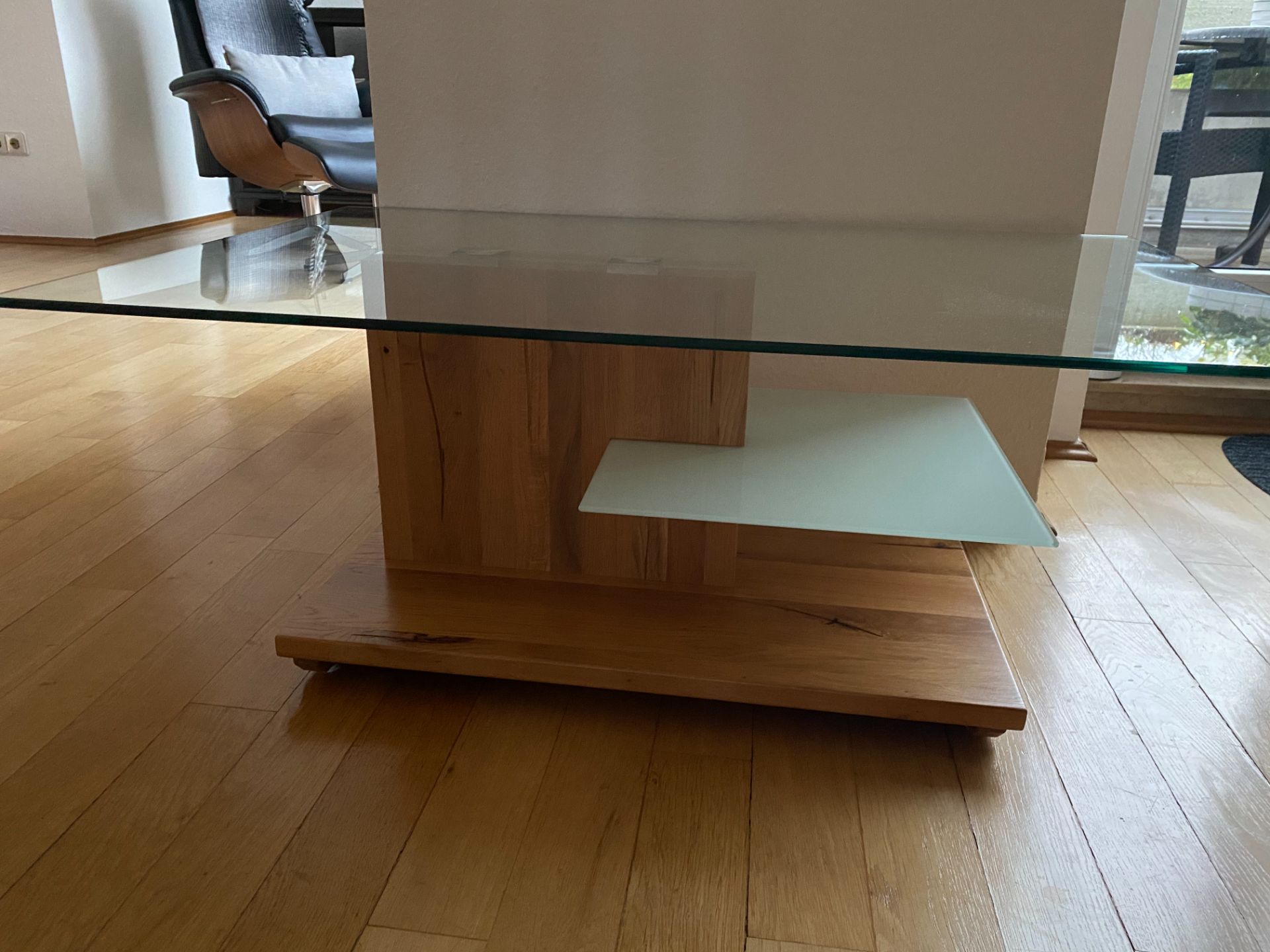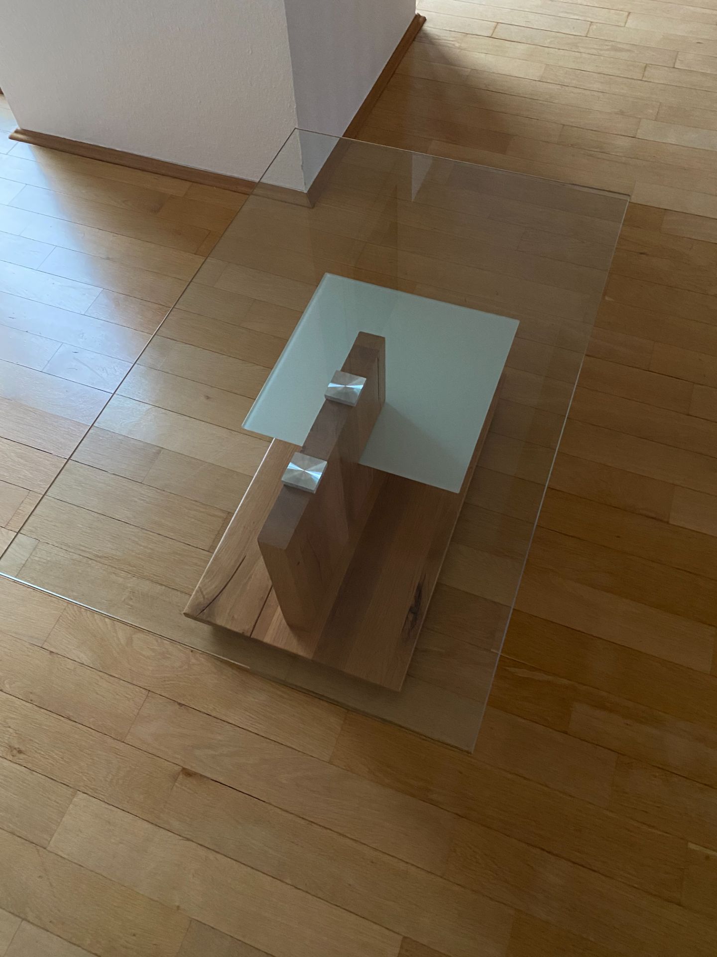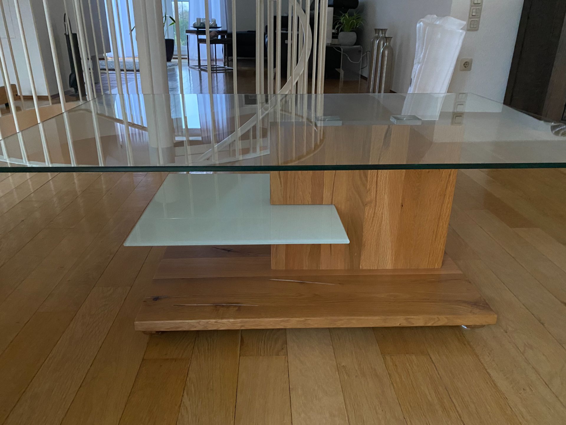 Couchtisch, Gestell Wildeiche Massiv lackiert, Oberplatte Klarglas, Ablageplatte Glas weiß Belastung: Sicherheitsglas max. 20kg, Ablageplatte 2kg