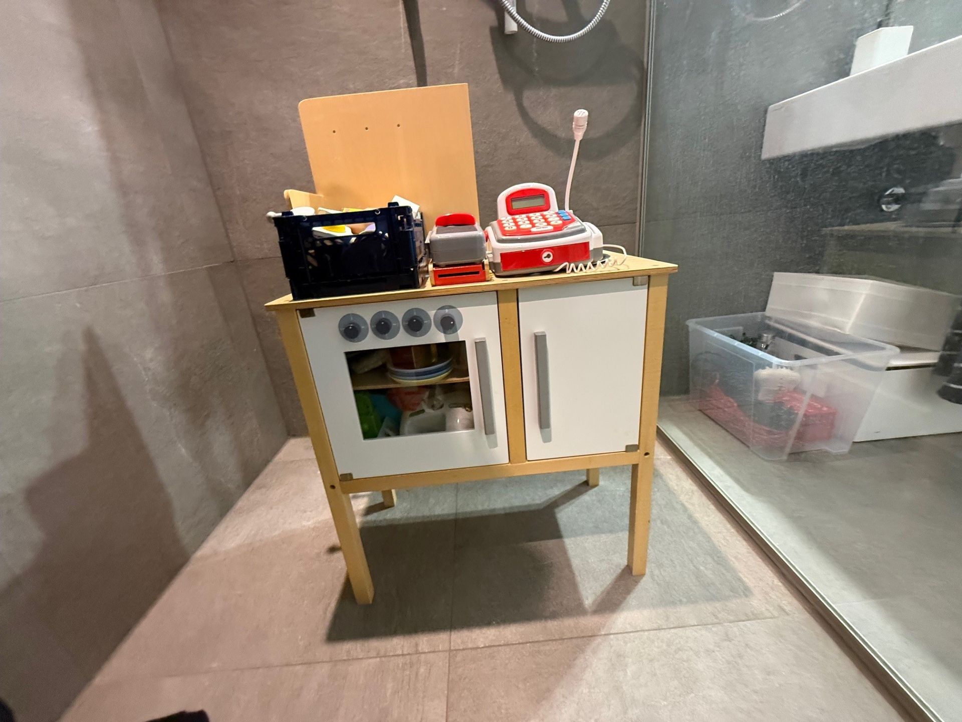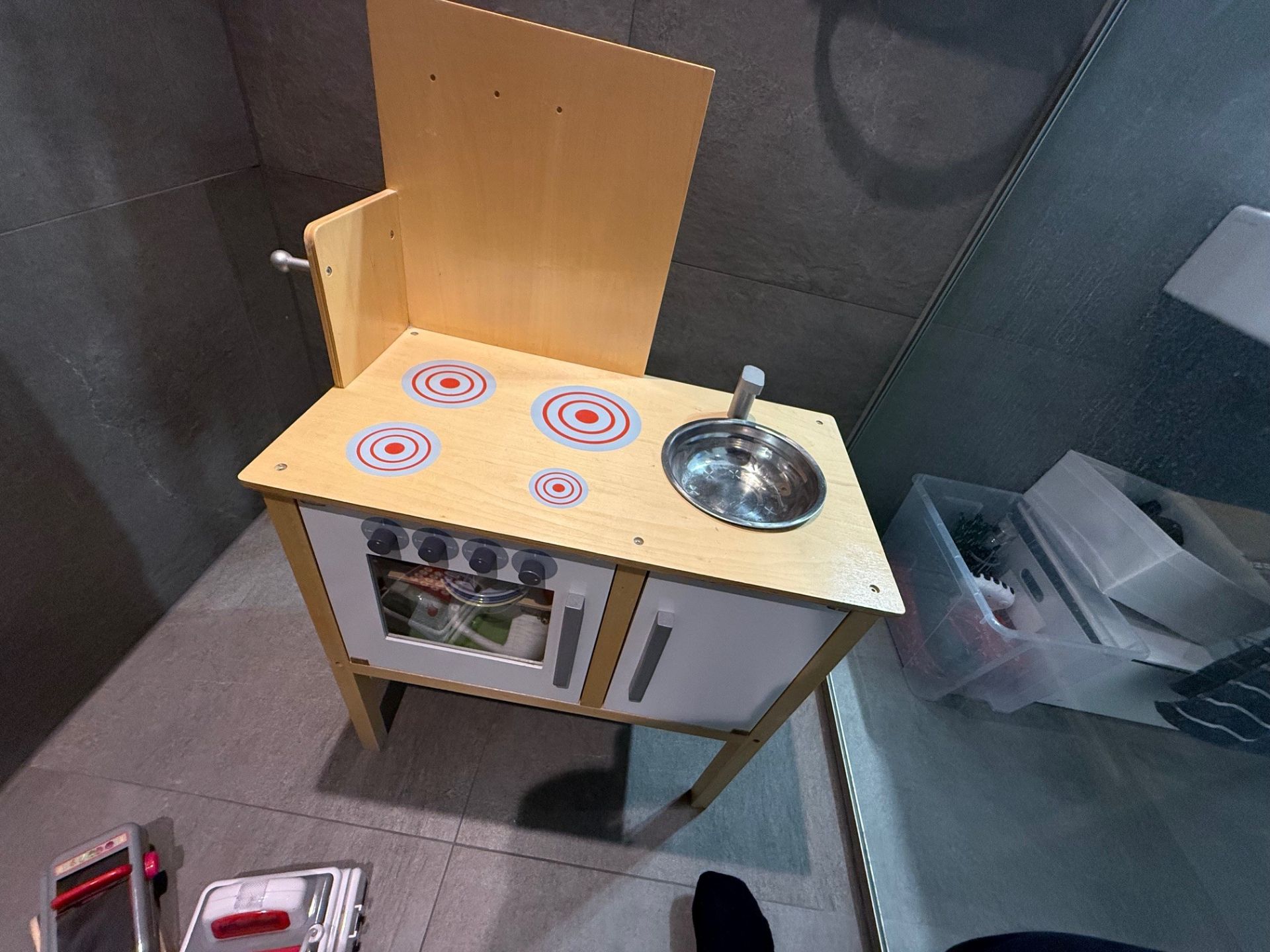 Kinderküche mit viel Zubehör (Töpfe, Teller, Becher, Holzgemüse, Rührgerät, ...) Vielleicht noch als Weihnachtsgeschenk für kleine Kinder?