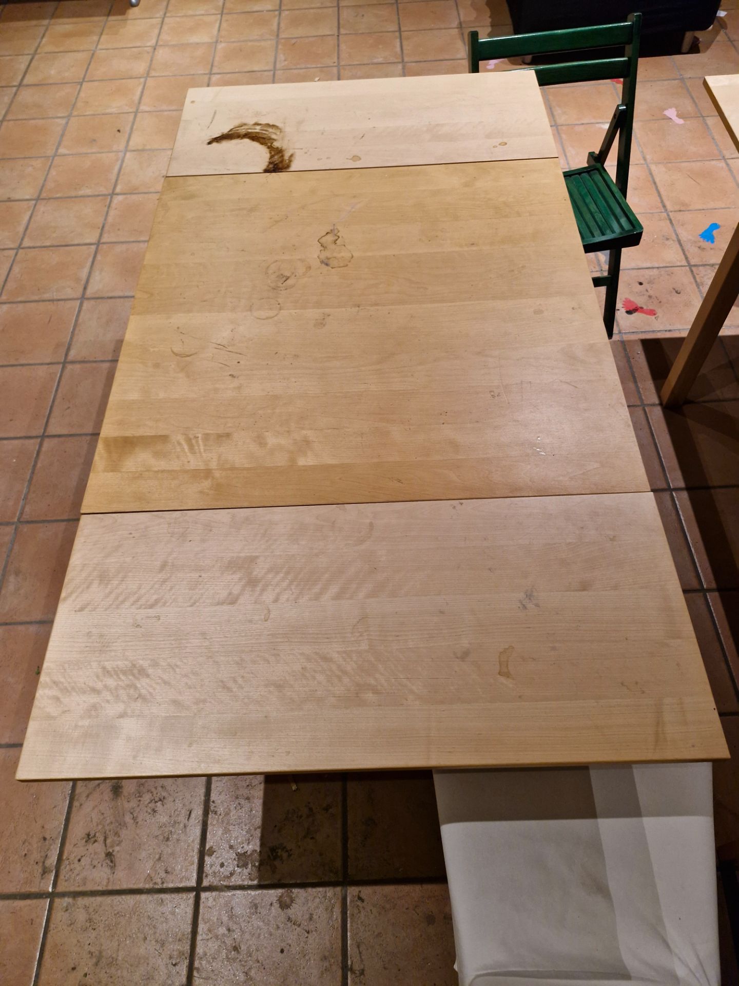 Tische zusammen als Besprechungstisch genutzt, daher immer ausgeklappt Leichte Kratzer und Gebrauchsspuren 90x90cm *Eine Verlängerung: 129x90cm *Zwei Verlängerungen: 168x90cm *Farbe: Buche