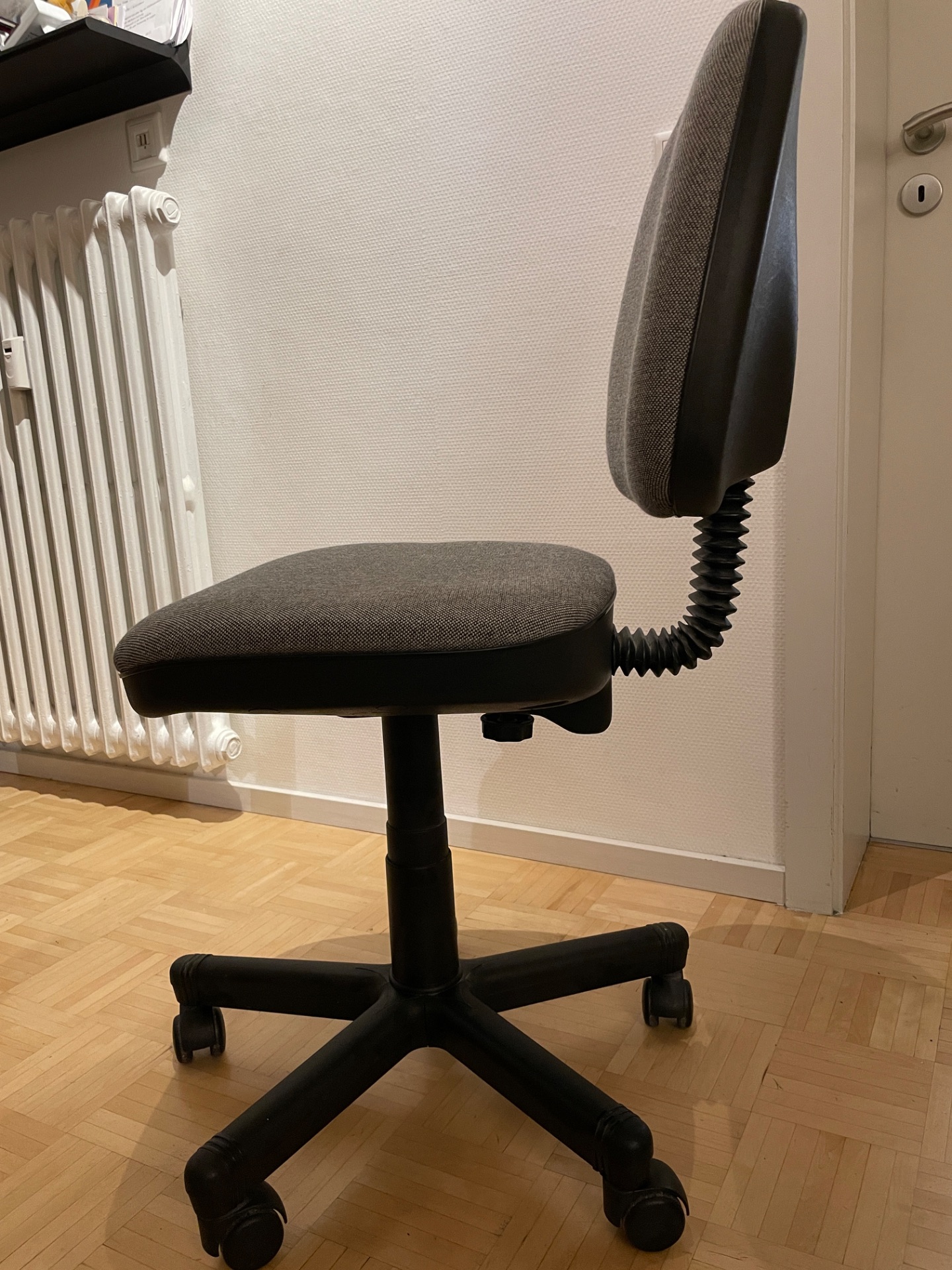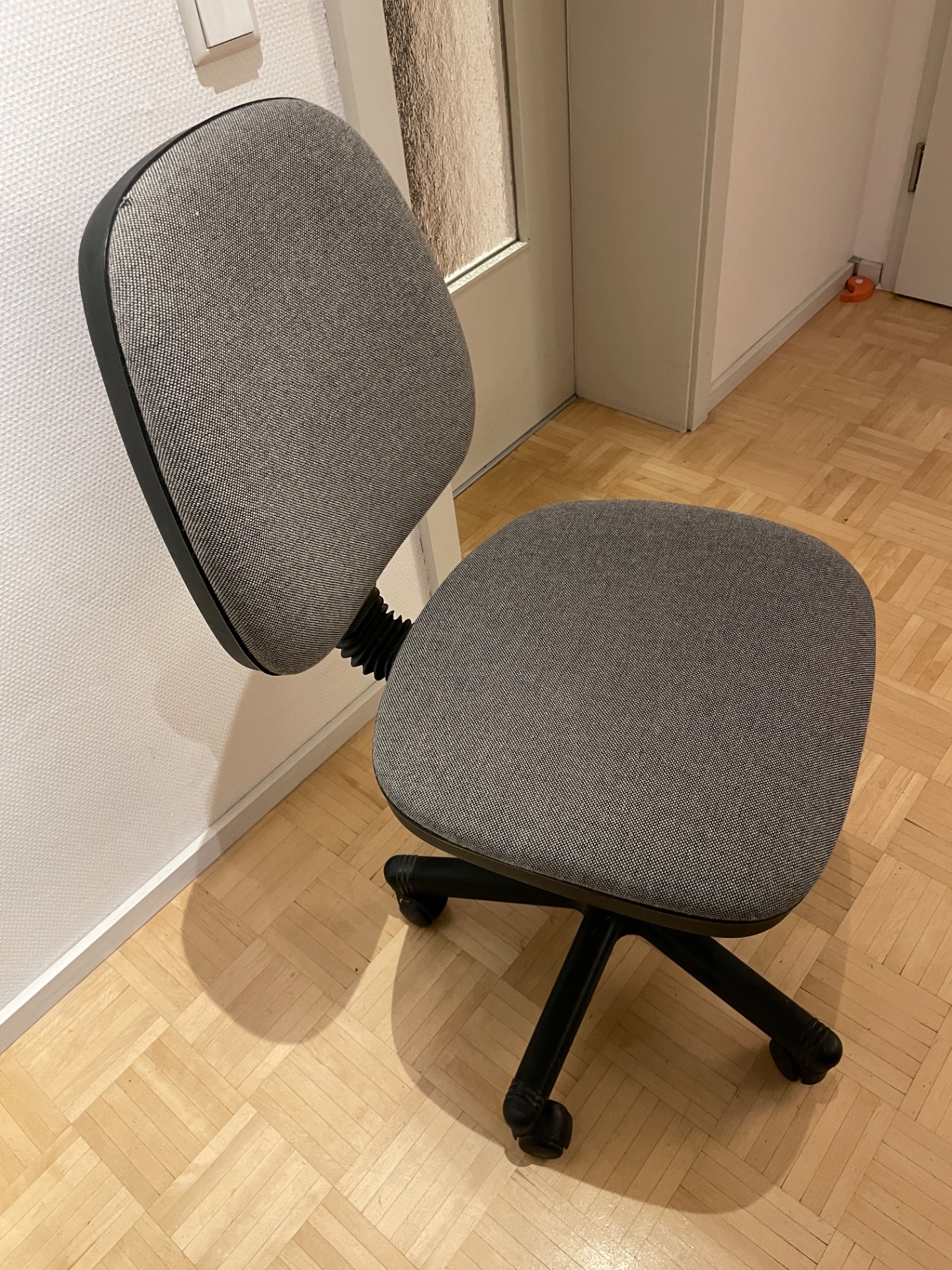 Einfacher Bürostuhl, grauer Textilbezug, Gasfeder in Ordnung